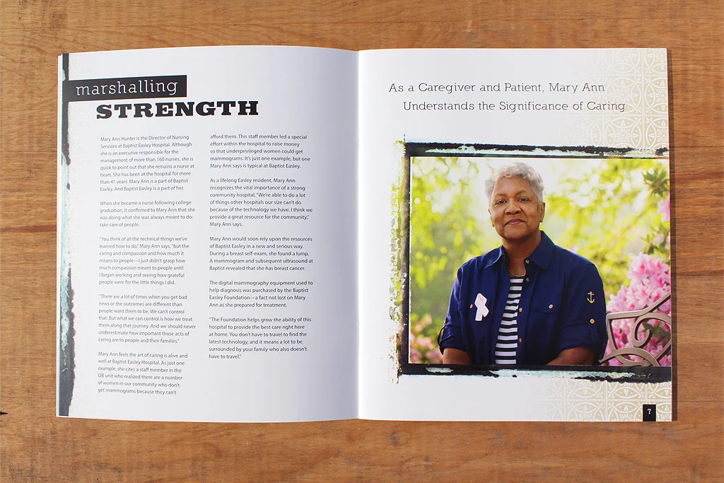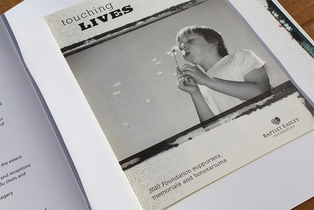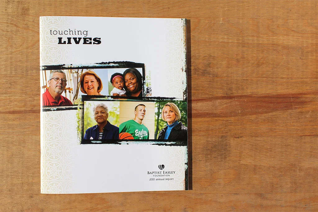 Working with Rodney Rogers from R2 Copy we were hired to create an annual report for the Baptist Easley Foundation. In the past their annual reports had stuck to the idea of highlighting the basics of how the foundation benefits the Baptist Easley Hospital. After a couple of conversations with the director it was pretty obvious this hospital was a crucial part of this relatively small town. There were so many ways the Foundation and Hospital impacted the community. We focused on the idea of how they touch peoples lives thus the theme of “Touching Lives”. In a few short hours the Foundation easily put together many, many candidates for possible stories. It was evident the community has stories to tell so away we went to tell them. With some great photography from George Lee we were able to put together an great report that lets people know how the money they contribute affects the community the live in. Since we used so many pages telling the stories we had to come up with a simple way to highlight the contributors – which was done simply with an accordion fold out printed 1 color and glued to the back inside cover.